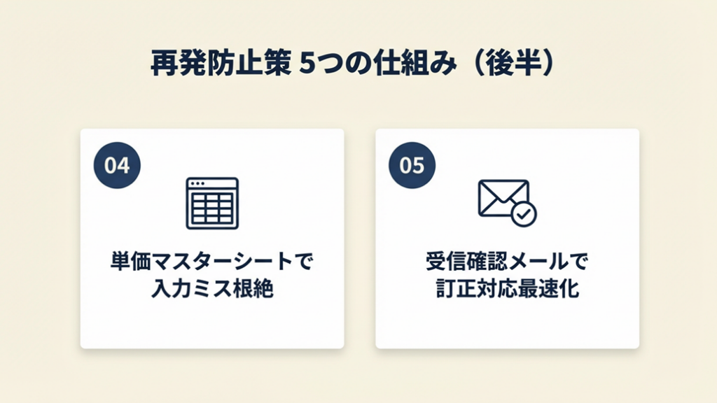 - 【ポイント】: 「正しい単価は頭に入っている」という記憶に頼らず、「マスターシートを必ず参照する」ことで単価ミスを防止できます。