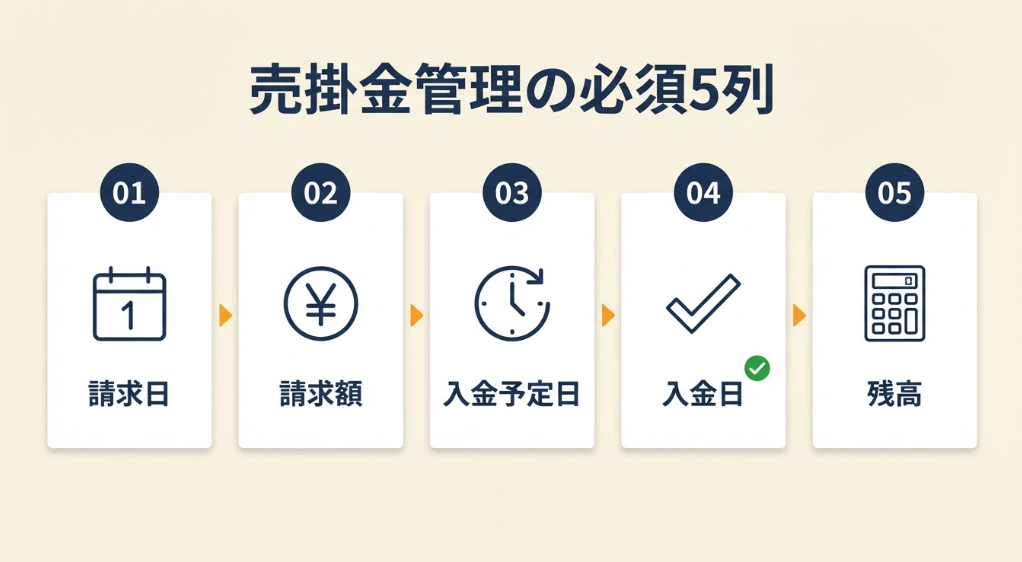 売掛金管理表に最低限必要な列は「請求日」「請求額」「入金予定日」「入金日」「残高」の5つです。これに「顧客名」「請求番号」を加えた7列が実務上の標準構成になります。