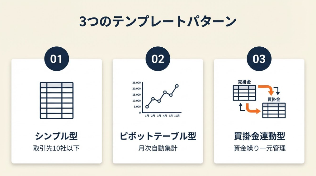 ・自社の取引先数を確認し、10社以下 → シンプル型、10〜50社 → ピボットテーブル型、買掛金も管理 → 連動型を選択してください(5分)