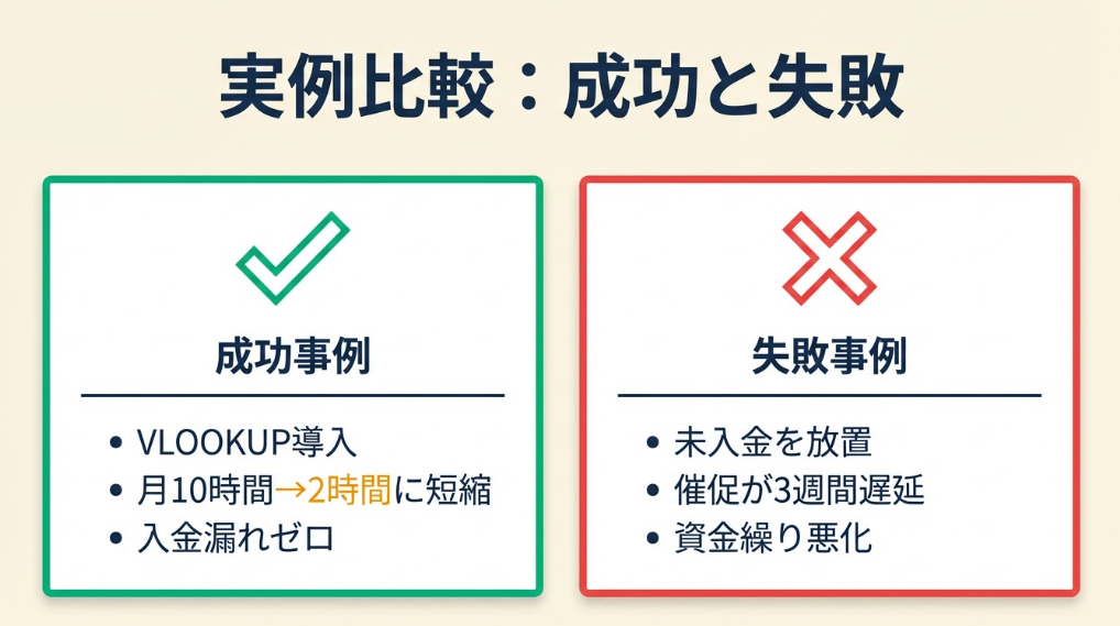 分岐点: VLOOKUPを導入せず手作業を続けていた場合、取引先が増えるたびに作業時間が増加し、入金漏れのリスクも比例して高まっていました。
