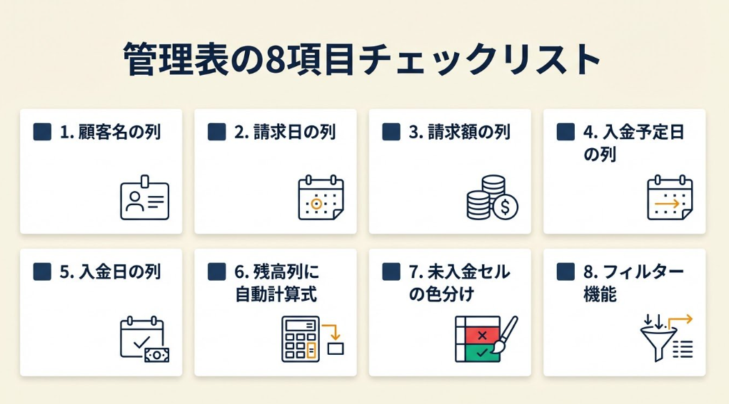 まずは今日中に管理表の必須5列(請求日・請求額・入金予定日・入金日・残高)を作成し、直近3か月分のデータを入力するところから始めてください。