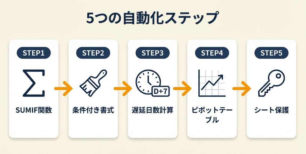 方法1(SUMIF)→ 方法2(条件付き書式)→ 方法3(遅延日数)の順がおすすめです。この3つで管理表の基本機能が完成します。方法4・5は運用が安定した後に追加してください。