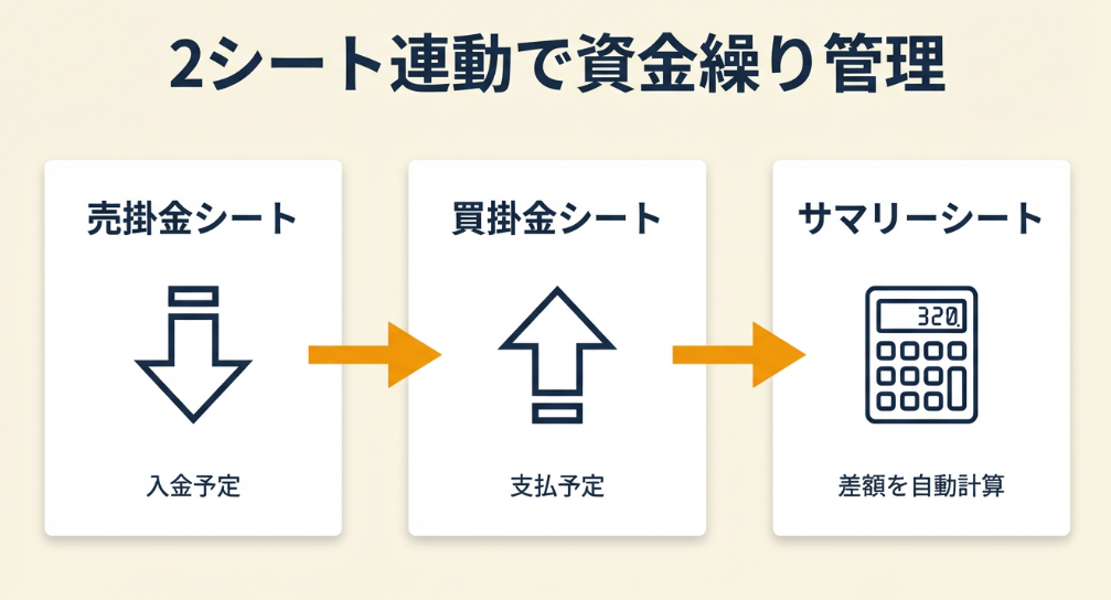 3枚目のシートに「月次サマリー」を作成し、売掛金シートの月間入金予定額と買掛金シートの月間支払予定額の差額を自動計算します。計算式は=売掛金シートの月次合計-買掛金シートの月次合計です。