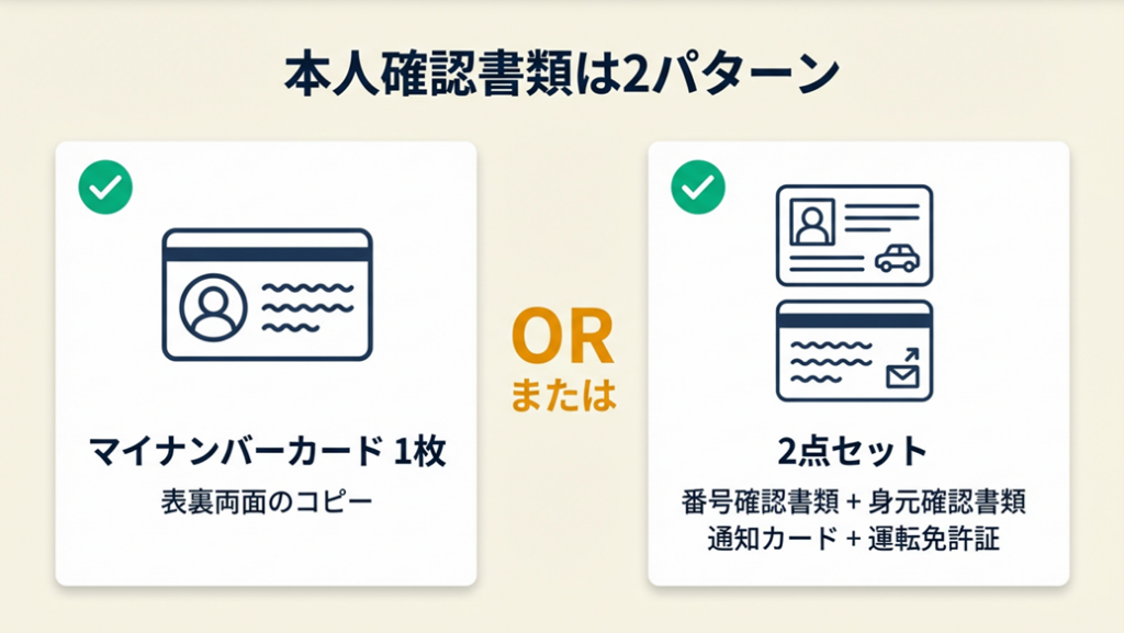 -> 手元の本人確認書類がマイナンバーカード1枚か2点セットかを確認し、両面コピーを今日中に取得する(3分)