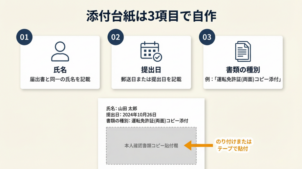 -> 添付台紙(A4白紙)に氏名・提出日・書類種別を記載し、本人確認書類コピーをのり付けする(5分)