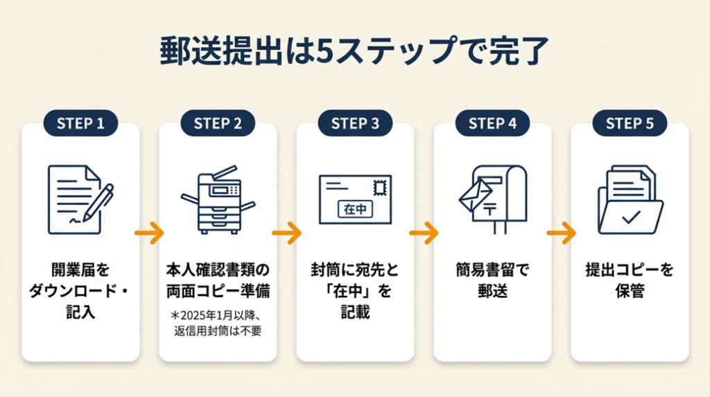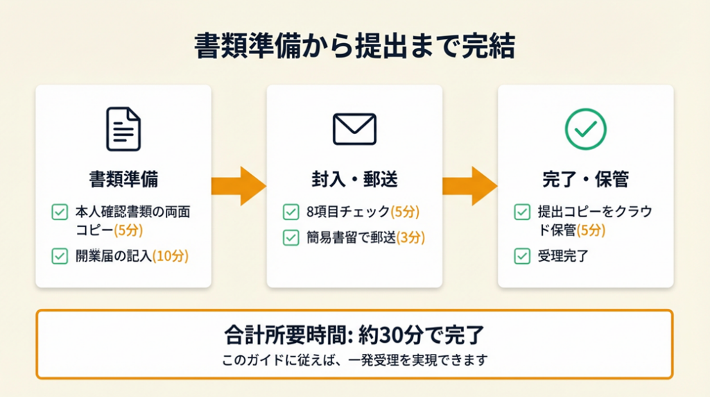 | 郵送手順を今すぐ確認したい | 開業届郵送は5ステップで完了 | 5分 |