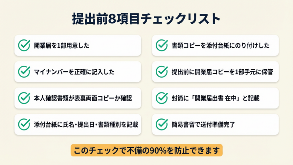 多い不備は「本人確認書類コピーが片面のみ」「開業届のマイナンバー記入漏れ」「添付台紙への貼り忘れ」の3つです。封入前に「両面・マイナンバー・のり付け」という3つのキーワードを声に出して確認するだけで不備の大半は防げます。
