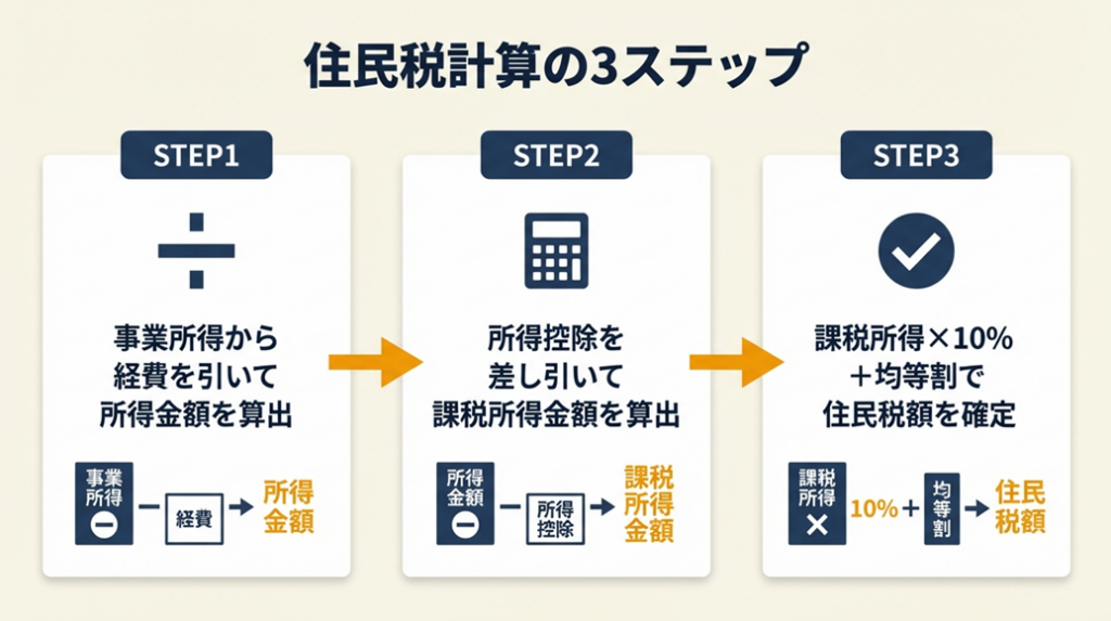 「どこから何を引けばいいのか複雑すぎてわからない」という悩みは、個人事業主なら誰もが通る道です。住民税の計算は手順を分解すると、3つのステップに整理できます。