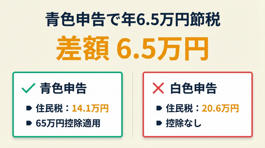 青色申告65万円控除の適用により年間65,000円の住民税節税効果が生まれます。この差は5年間で325,000円になるため、青色申告への切り替えは最優先の対策です。