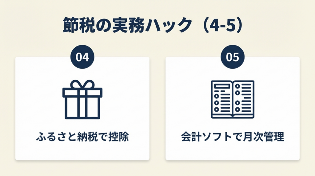 - 【なぜ効くのか】: 住民税は「前年所得で決まる翌年の税金」であるため、当年中に所得をコントロールするには月次把握が不可欠です。12月末に所得が見えていれば、経費の前倒し計上(消耗品の年末購入等)による所得圧縮が合法的に可能になります。また月次仕訳は税理士への依頼コストも削減できます。