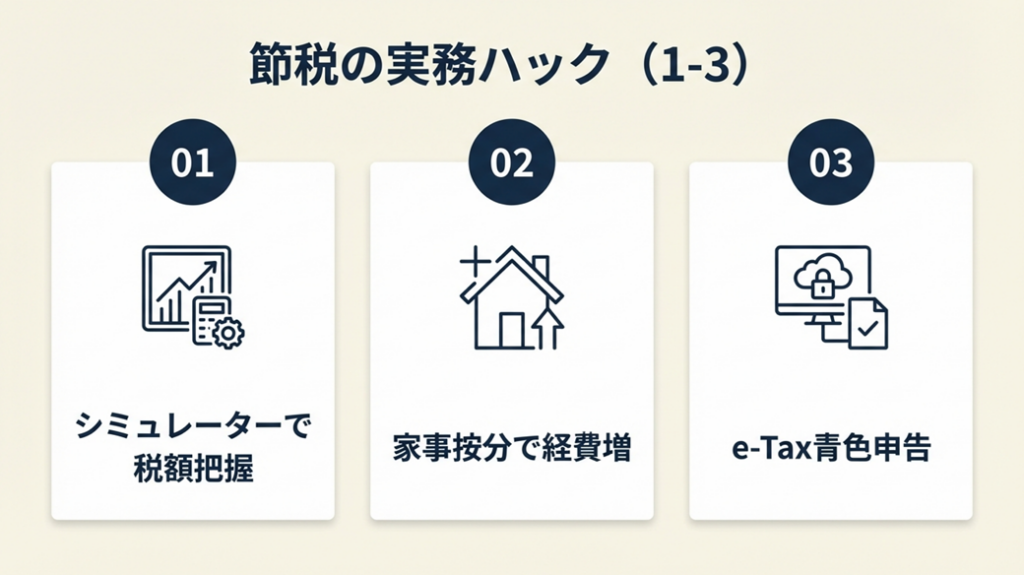 - 【効果】: 家事按分の適切な計上で年間経費が10〜30万円増加し、住民税を1〜3万円削減