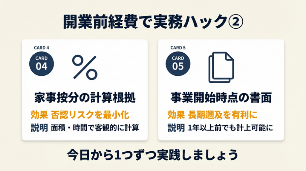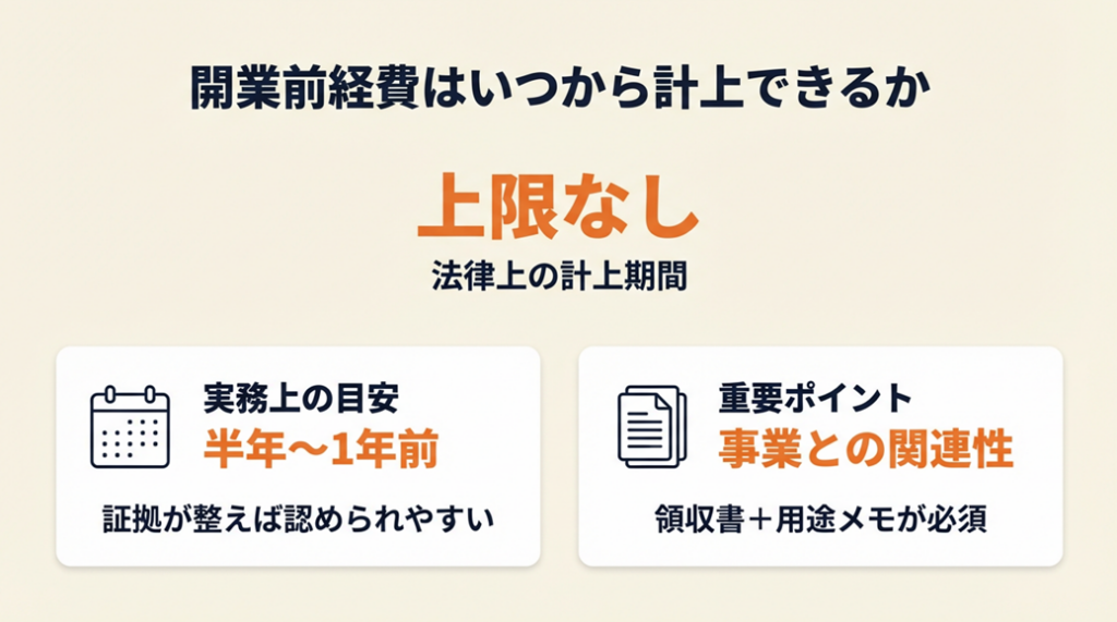 - 【ポイント】: 「開業日から1年前だけ計上する」という考え方が一般的ですが、「事業との因果関係を客観的に証明できれば1年以上前でも計上可能」というのが法律の実際の姿です。準備期間が長かった事実は「証明できれば」有利に使えます。