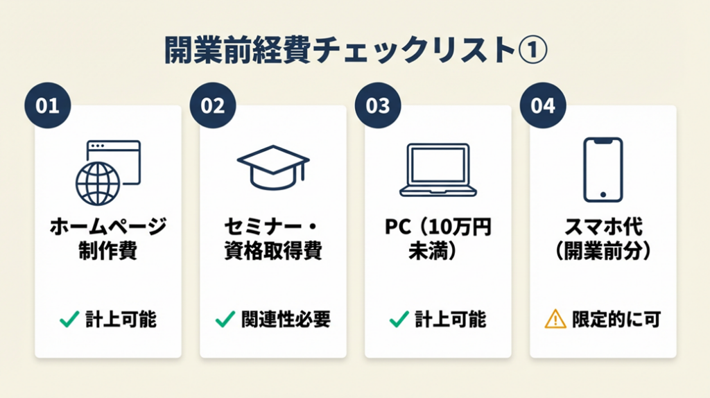 | 通信費(開業前分) | 開業準備で使ったスマートフォン代 | ○(期間限定) |