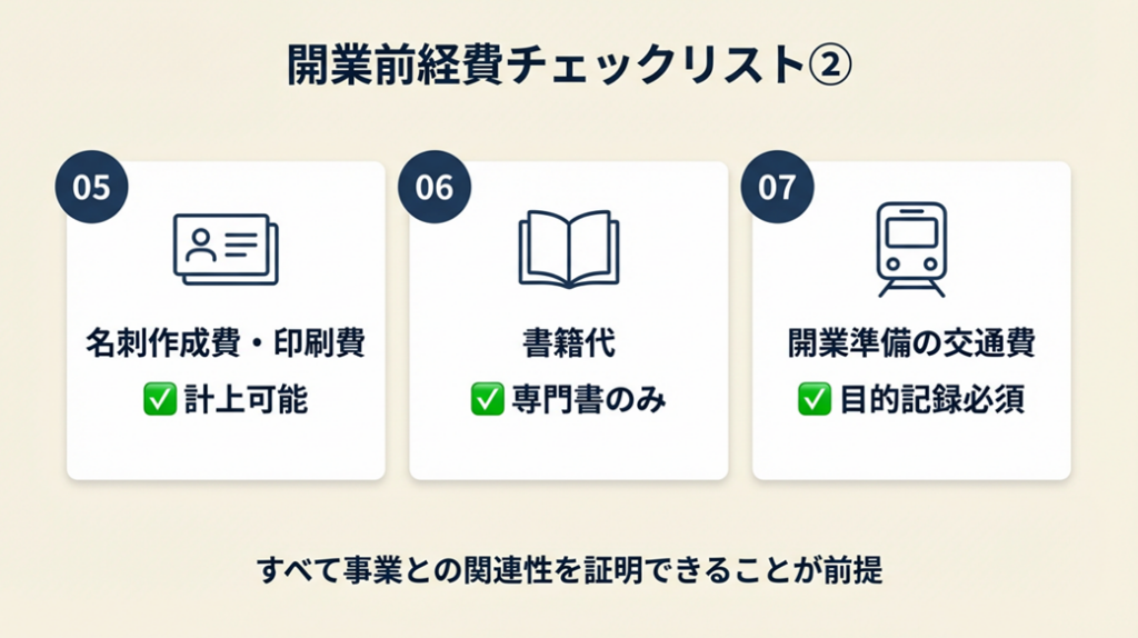 | 開業準備の打ち合わせ交際費 | 取引先候補との名刺交換時の飲食代 | ○(要記録) |