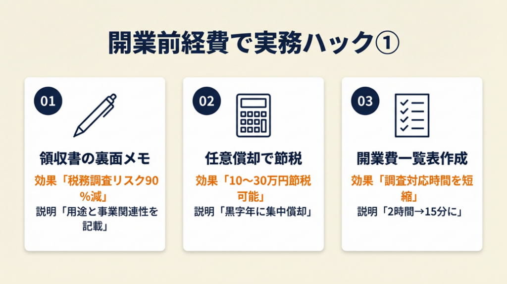 | 税務調査リスクを確認したい | 開業前経費で5つの実務ハック | 10分 |