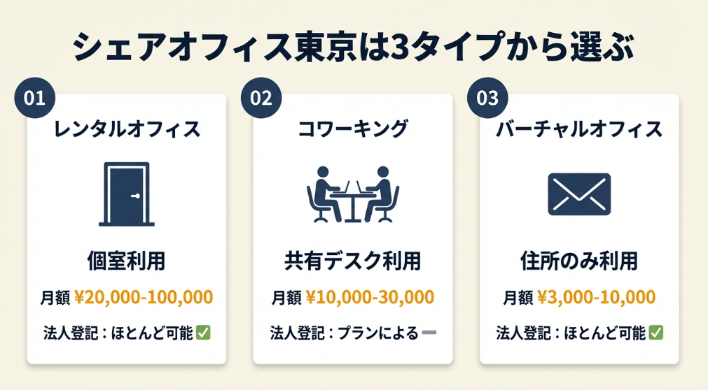 シェアオフィスという言葉は広く使われていますが、実際には3つのタイプがあり、登記可否・料金・利用形態が大きく異なります。東京で法人登記を検討しているなら、まずこの違いを押さえることが出発点です。