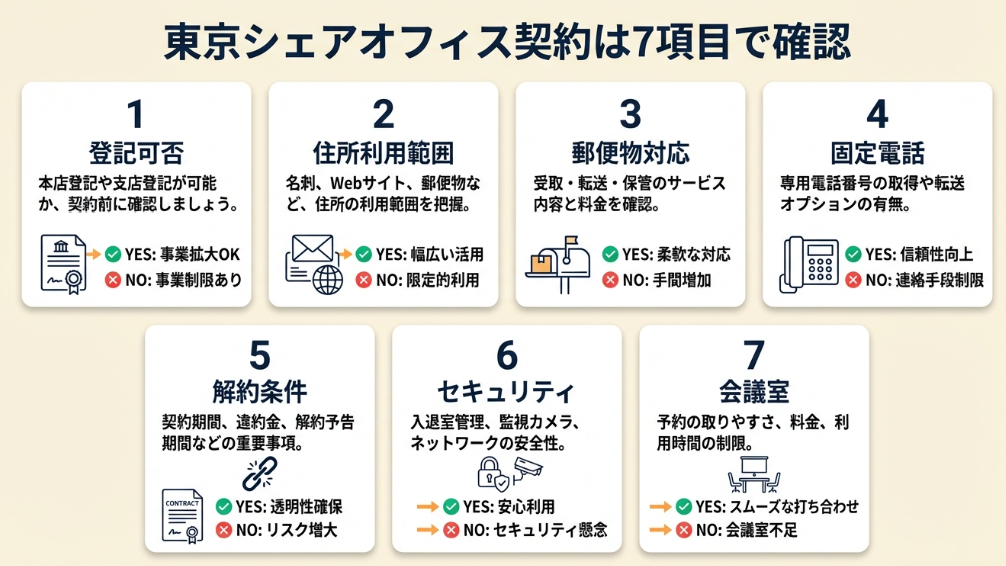 | 契約前の確認事項を整理したい | 東京シェアオフィス契約は7項目で確認 | 4分 |
