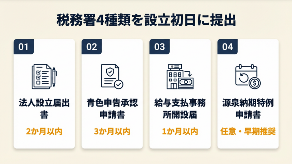 A: はい、法人設立届出書・青色申告承認申請書・給与支払事務所開設届・源泉納期特例申請書は設立初日にまとめて提出してください。窓口でもe-Taxでも一括提出が可能です。
