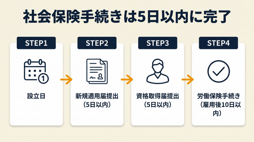 社会保険の手続きは期限の短さで多くの経営者がつまずく場面です。適用事業所の要件に該当した日から5日以内という期限が法律で定められており、「設立後に余裕ができてから」では間に合いません。