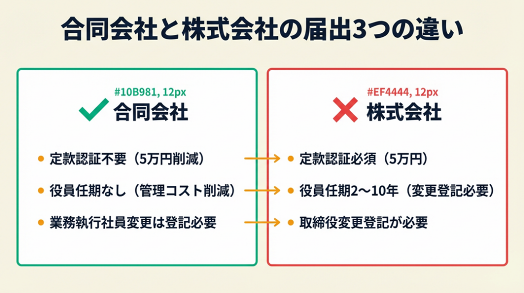 株式会社は役員の任期(原則2年、最長10年)が到来するたびに変更登記が必要です。合同会社は任期の定めがなく、変更登記のコストが発生しません。役員1名・事業拡大予定がない場合は合同会社の方が管理コストを年平均1〜2万円削減できます。将来的に投資家から出資を受けたい場合は株式会社が必須となるため、出口戦略を先に決めてから法人形態を選んでください。