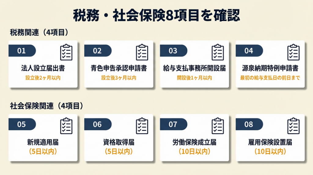 届出漏れは「知らなかった」では済まない場面もあります。以下の10項目を設立日ごとに確認してください。