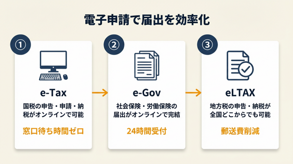 - 【なぜ効くのか】: e-Taxは受信通知がリアルタイムで届くため、提出確認の往復連絡が不要になります。1書類あたりの確認工数が約20分削減されます。税務署が電子申請を優先的に処理する仕組みを導入しているため、窓口より処理速度が速い場合があります。