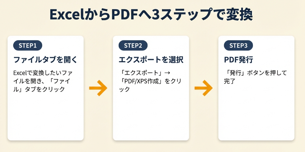 Excel PDF変換は標準機能を使えば3ステップで完了し、追加ソフトは不要です。