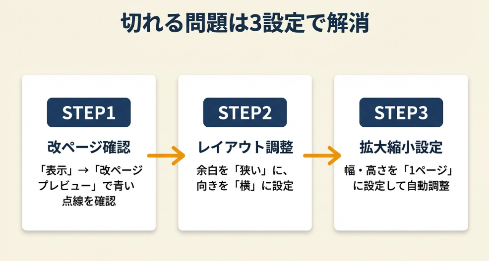 「ページレイアウト」タブの「拡大縮小印刷」で「幅:1ページ」「高さ:1ページ」を設定すると、データ全体が自動的に1ページに収まるよう縮小されます。この設定を行うだけで多くの切れ問題が解消されます。