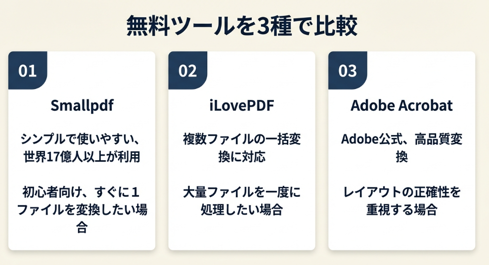| Adobe Acrobat Online | Adobe公式、高品質変換 | レイアウトの正確性を重視する場合 |