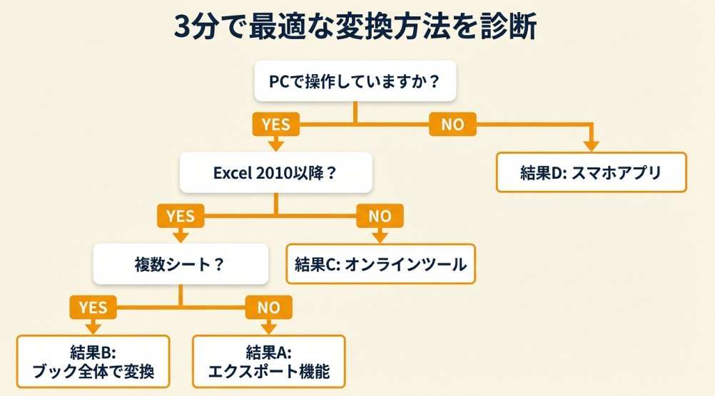 どの方法で変換すればいいか、判断に迷う方も多いはず。以下の診断で3分以内に最適な変換方法を判定できます。