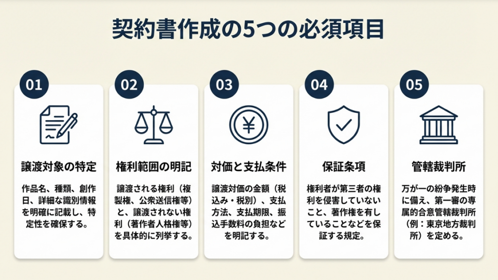 ・必須5項目:譲渡対象の特定・権利範囲・対価・保証・管轄裁判所