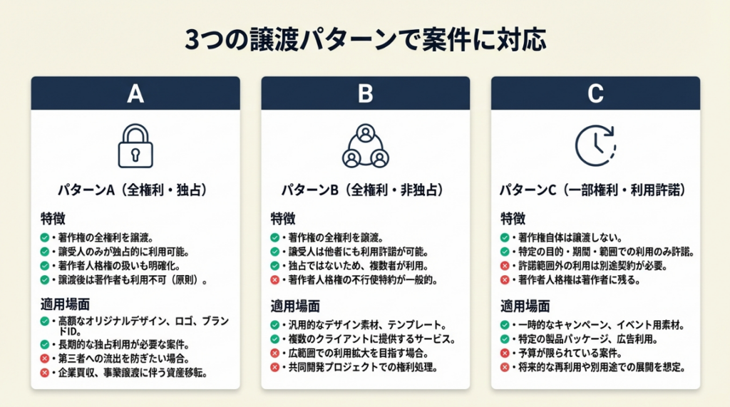 デザイン・物品案件での著作権譲渡は、以下の3パターンが実務上の主流です。