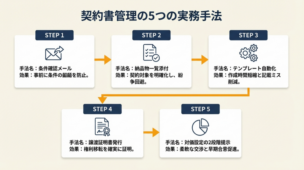 - 契約締結後、「著作権譲渡証明書(証明書番号・譲渡日・著作物名・対価・両者署名欄)」をA4・1枚で作成する(10分)