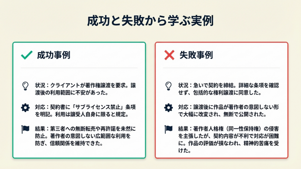 | 過去の失敗事例を確認したい | 著作権譲渡契約書は2事例で失敗を防ぐ | 5分 |