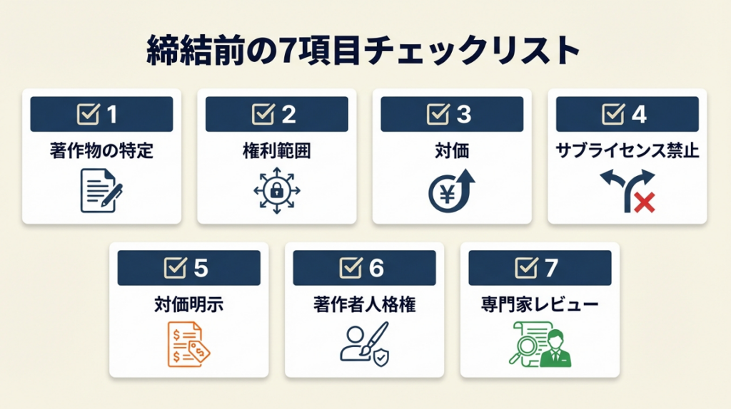 チェック7:「専門家レビューの要否判断」をした。契約金額が50万円を超える案件や、著作物が事業の核となる場合は弁護士への確認を検討してください(費用目安:1契約のレビューで1〜3万円)。