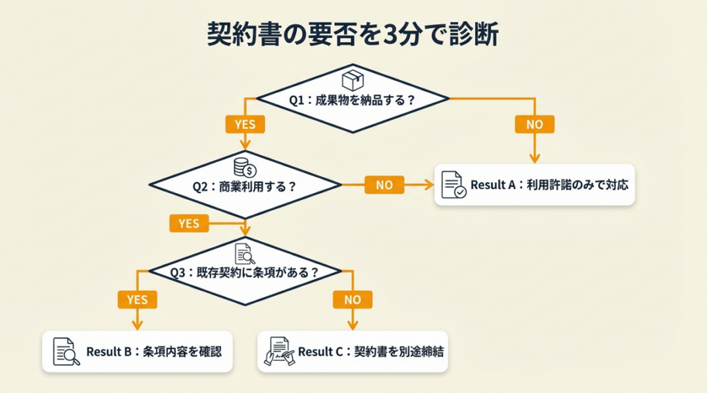業務委託契約書だけで対応できるケースもあれば、別途著作権譲渡契約書を締結しないとトラブルになるケースもあります。次の質問で3分以内に判断してください。