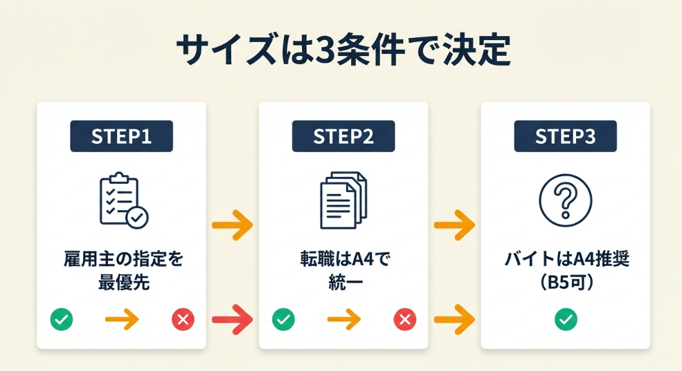 履歴書のサイズ選びは「応募先の指定」「書類の統一」「記入量」の3条件で判断できます。A4とB5のどちらを選んでも選考結果に影響はないため、サイズで過度に悩む必要はありません。以下の3条件を順にチェックしてください。