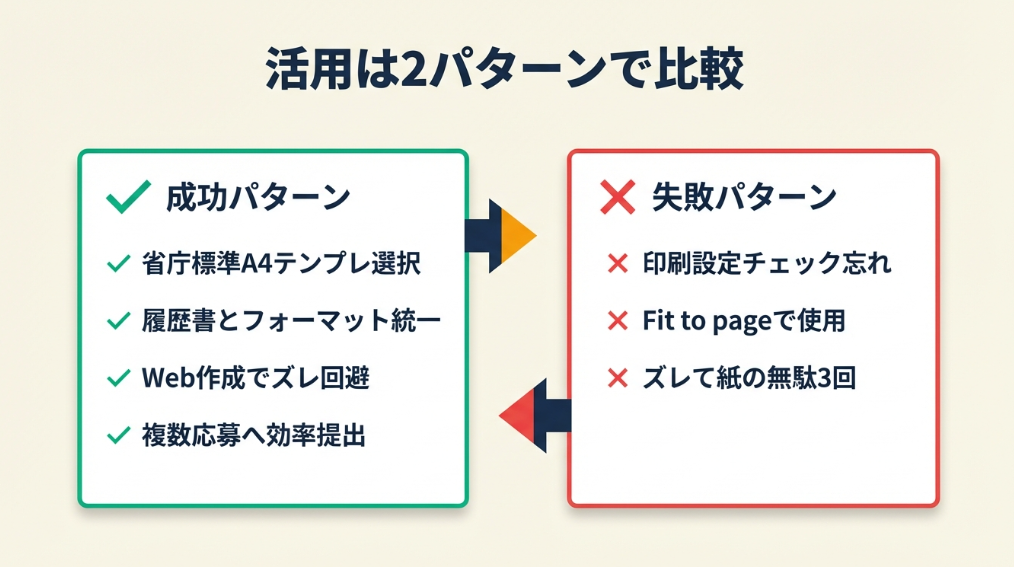 テンプレートの選び方と印刷設定で結果がどう変わるか、成功パターンと失敗パターンを実際の体験談をもとに比較します。自分の状況に近いケースを参考にしてください。