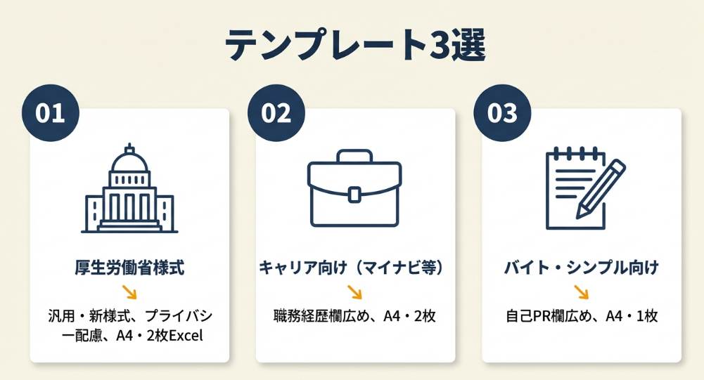 履歴書テンプレートは無料で数十種類が出回っていますが、実は大きく3タイプに分けられます。応募する目的に合わせて選べば、テンプレート探しに30分以上かける必要はありません。ここでは厚労省様式・転職用・アルバイト用の3タイプと、それぞれの使いどころを整理します。