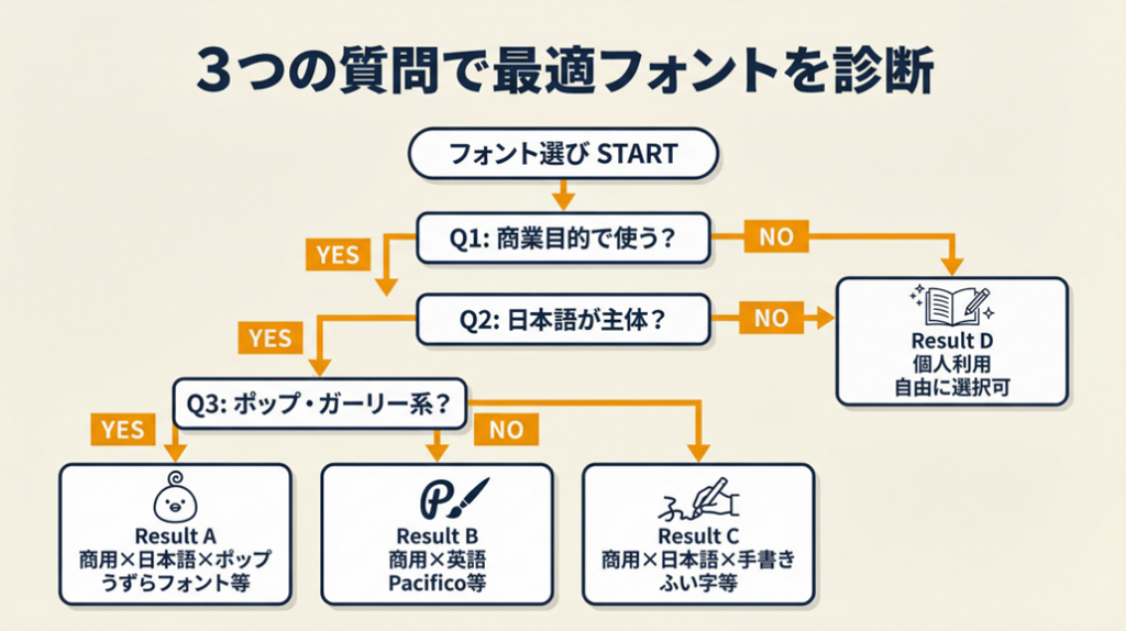 | 自分の状況に合うか判断したい | 可愛い無料フォントの選び方を3分で診断 | 3分 |
