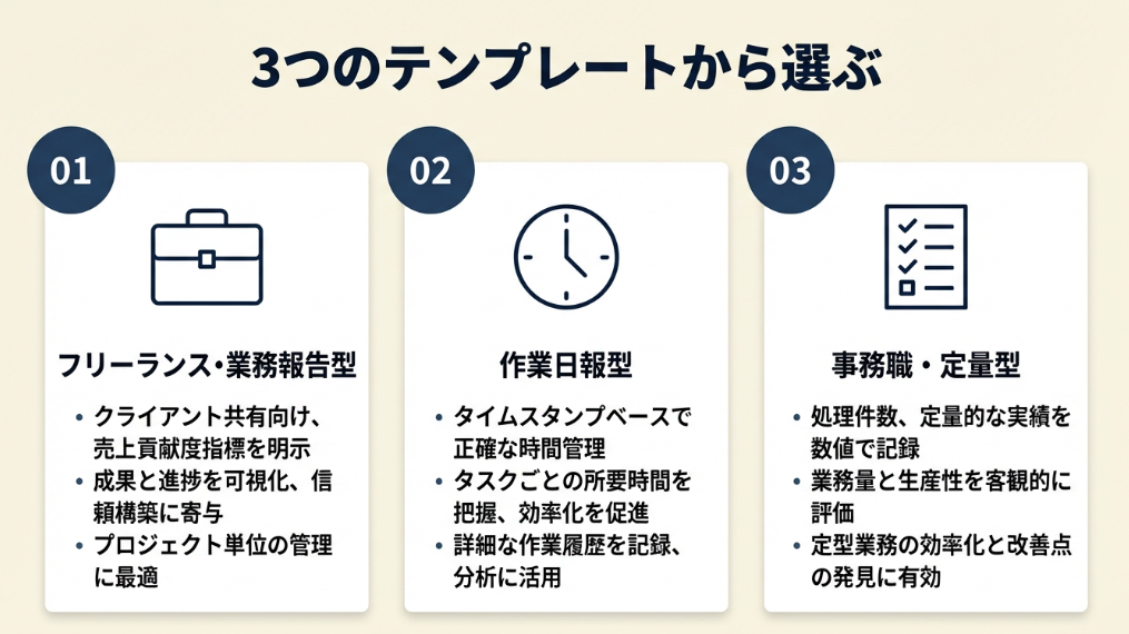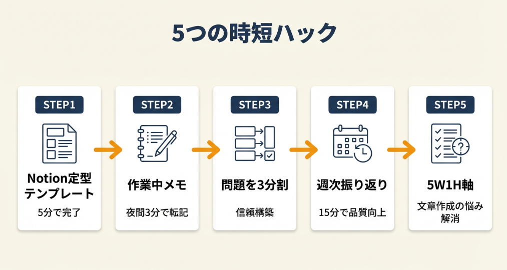 多くのフリーランスが「一から書く」という非効率なやり方で時間を浪費しています。5つの仕組みを導入することで、日報作成を構造的に短縮できます。