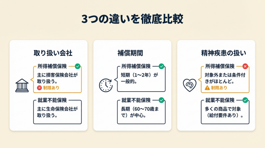 名前が似ているため同じ保険だと混同されますが、販売元の種別から補償期間、精神疾患の扱いまで、実務上は全く異なる設計です。3点の違いを押さえると、加入後に「思っていた保険と違った」という事態を防げます。