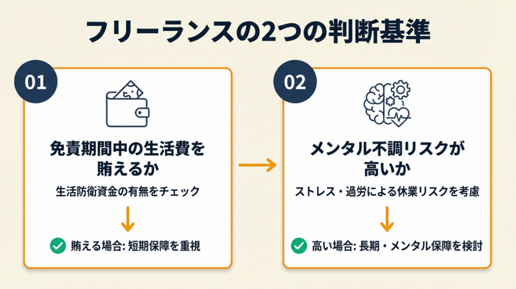 所得補償保険は損害保険会社が扱う短〜中期向けの保険で、ケガ・病気による就業不能時の日額・月額補償が主体です。就業不能保険は生命保険会社が扱い、精神疾患を含む長期の「働けない状態」を最長一生涯までカバーします。フリーランスは「免責期間中の生活費を貯蓄でカバーできるか」「メンタル不調リスクが高いか」の2点を軸に選ぶと、保険料と保障のバランスが最適化されます。