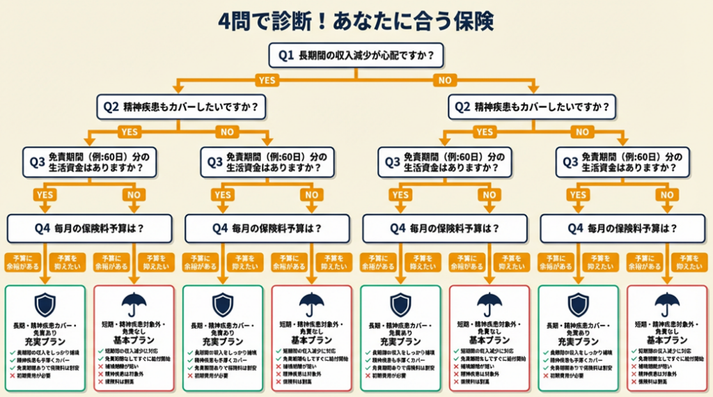 ケガ・病気のリスク主体で、精神疾患対応不要・手元資金が十分にある場合に最適です。免責期間180日型を選ぶと保険料を抑えられます。損害保険会社のパンフレットを取り寄せて給付条件を確認してください。
