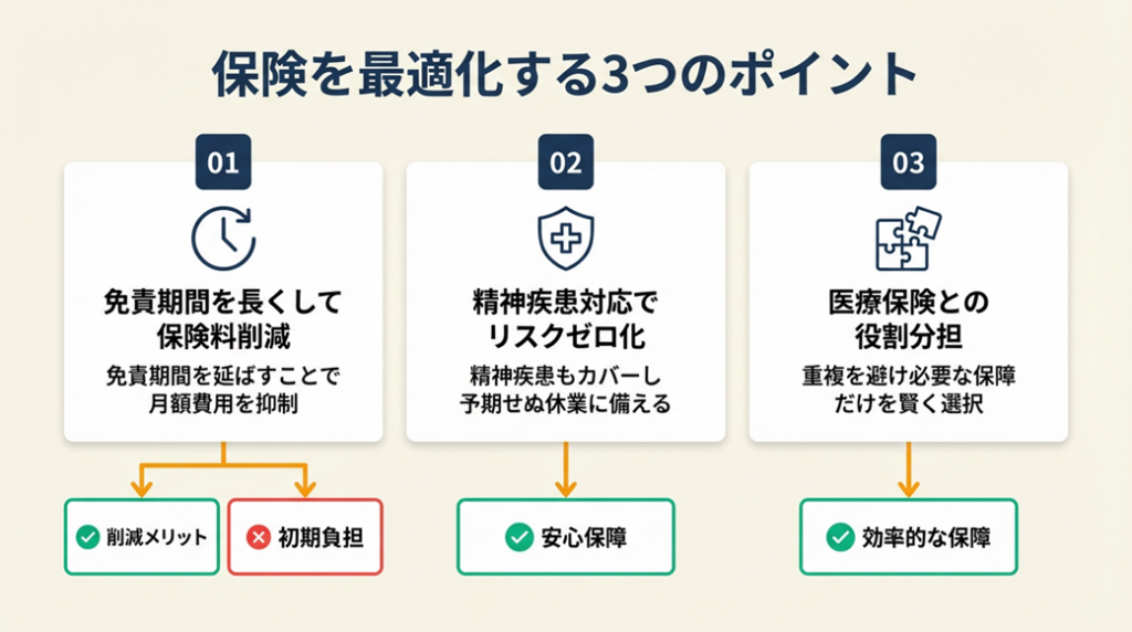- 【注意点】: 免責期間中は無収入でも保険給付はゼロ。手元資金が想定より早く減るケース(医療費発生など)も想定して、免責期間中の生活費に10〜20%の余裕を持たせてください。
