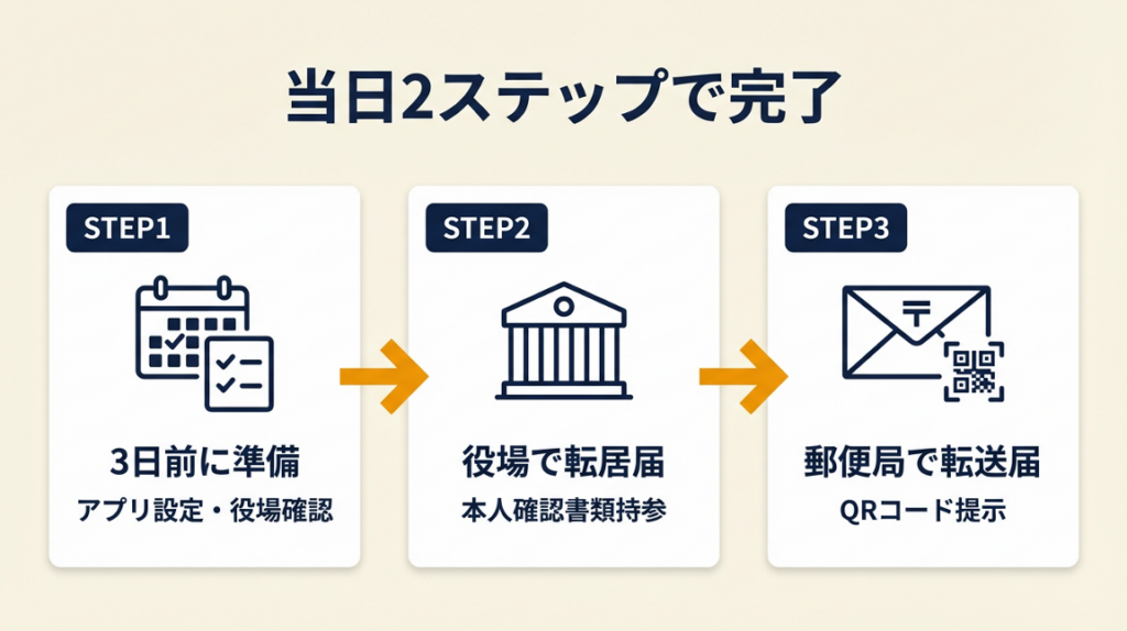 | 同日に両方提出したい | 転居届と転送届は当日2ステップで完了 | 5分 |