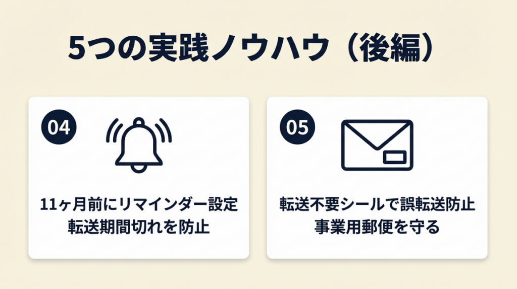 - 【コツ】: 「11ヶ月後のリマインダーを今すぐ設定する」ことが更新漏れを防ぐ最も確実な方法です。転送期間が切れた後の郵便不着は、気づくまでに時間がかかります。