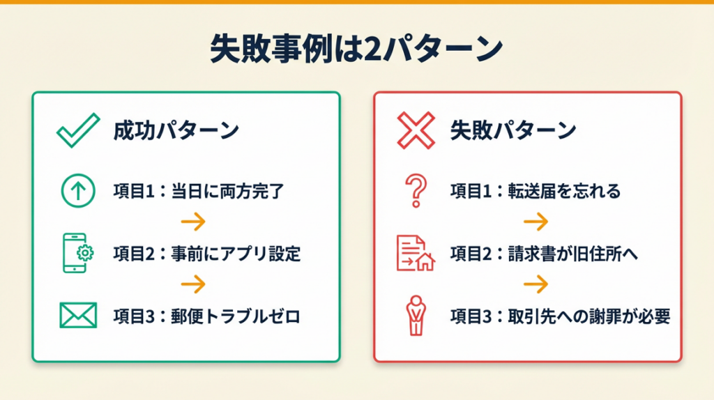 転送届の申請を後回しにしていれば、引っ越し後の数週間で届いた書類が旧住所に滞留し、取引先への対応が遅れていたはずです。「当日完結の段取りを3日前から組む」ことが最も効果的なリスク回避策です。