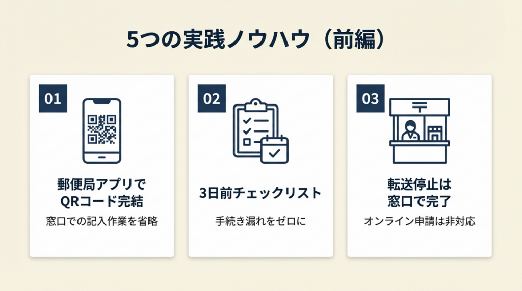 - 【なぜ効くのか】: 転送サービスの停止は住所情報の確認が必要なため、本人確認書類のある窓口でしか対応できない仕組みになっています。「転送停止=窓口一択」と覚えておくことが最も実務的です。