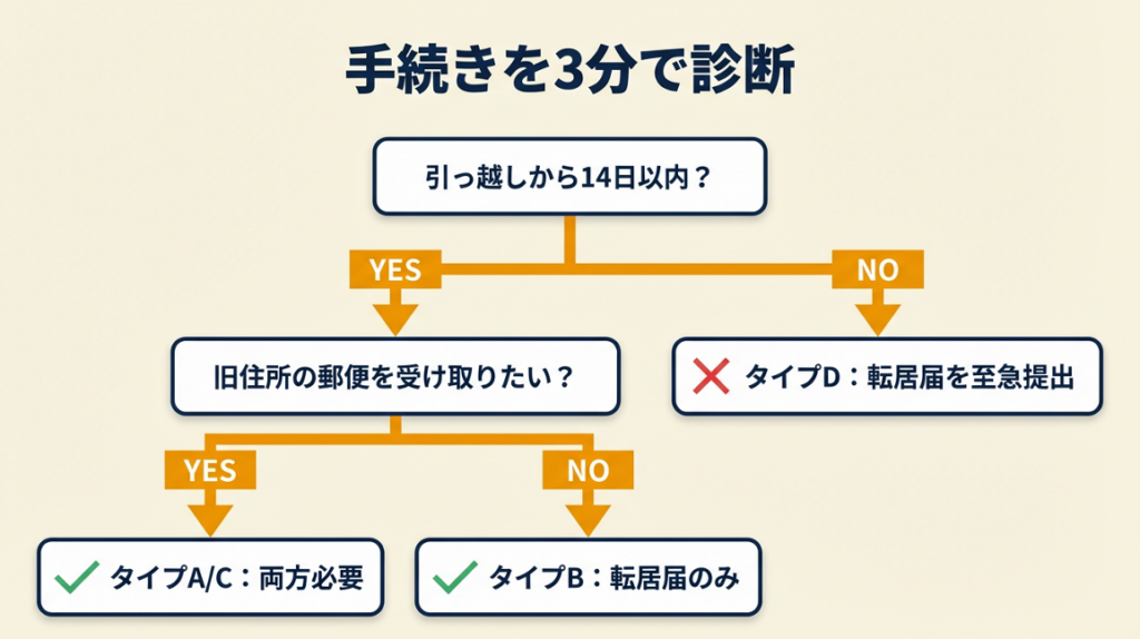「自分はどちらの手続きが必要か」を3分で確認できる診断フローを用意しました。フリーランスの方は特に、事業用と個人用の両方の郵便を考慮してください。